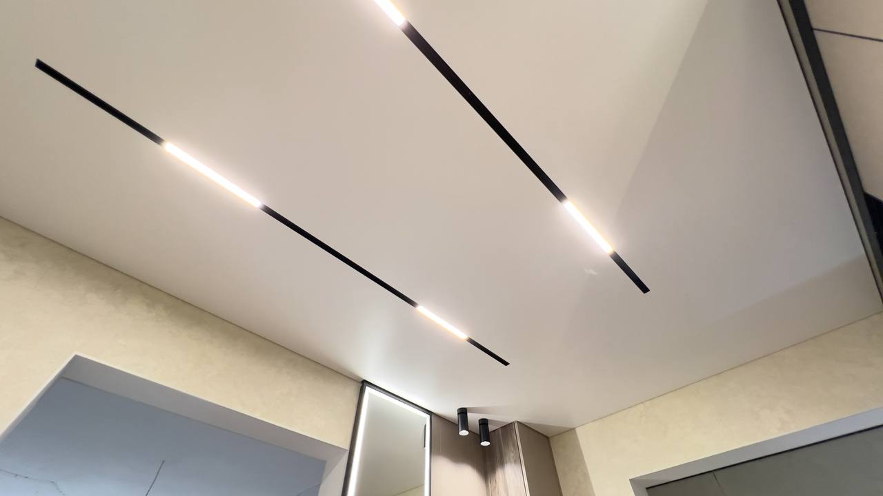 Эти покрытия подходят для одноуровневых и многоуровневых потолочных конструкций. Можно организовать контурную светодиодную подсветку, создать необычный эффект с помощью теневого профиля.